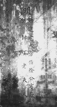 方柏公部考封安人寻以副使覃封恭人后以布政晋阶夫人生于嘉靖甲辰年四月二十八日卒于泰昌辛酉年十二月十八日与公合葬于此①乾山巽向坟境后憑两大塘埂人行横路为界前至门首塘墈为界左右俱以山脚为界